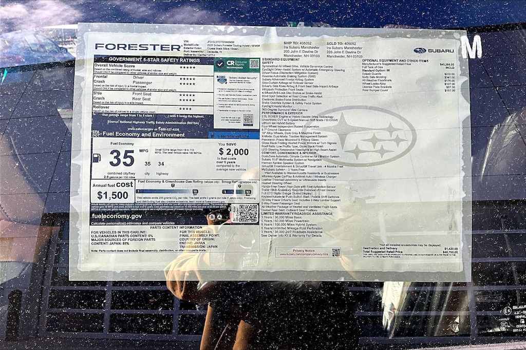 I bought this recently from Granite Subaru in Hudson, NH and I am so pleased I did. The Premium trim comes with great features AWD, Multiple cameras for safety, lane departure alert, 12" Media Screen with CarPlay, Panaramic Sunroof, roof racks, and much more. The size, features and gas mileage fit my life perfectly.