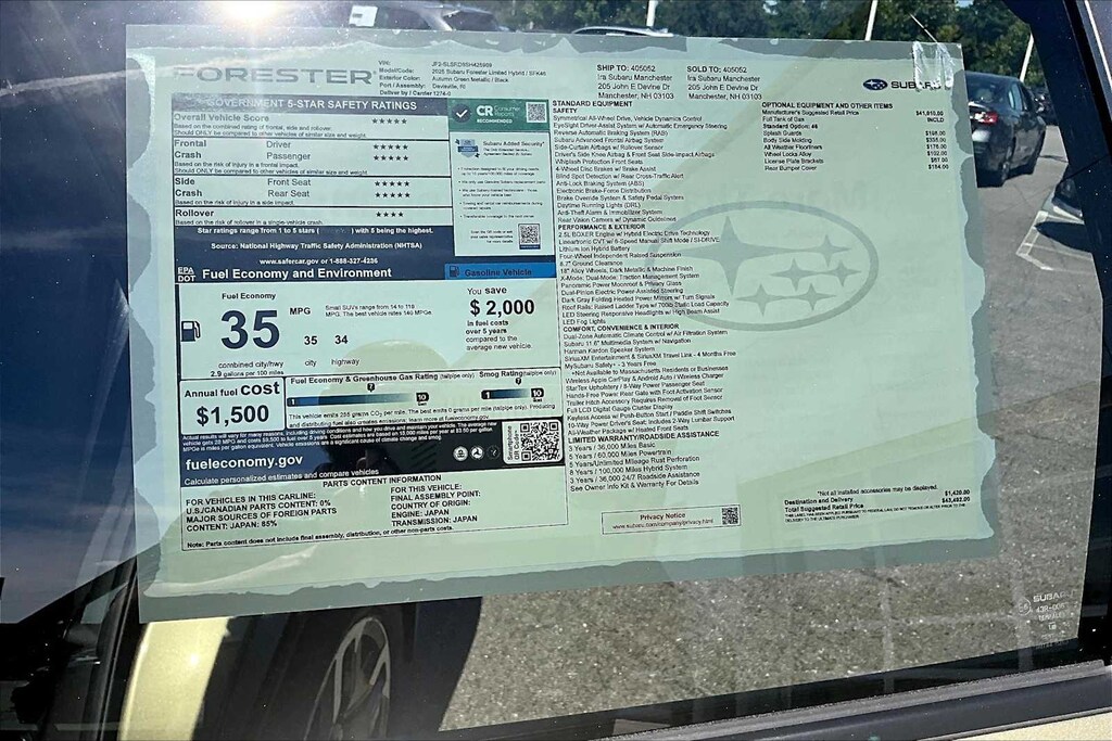 I bought this recently from Granite Subaru in Hudson, NH and I am so pleased I did. The Premium trim comes with great features AWD, Multiple cameras for safety, lane departure alert, 12" Media Screen with CarPlay, Panaramic Sunroof, roof racks, and much more. The size, features and gas mileage fit my life perfectly.