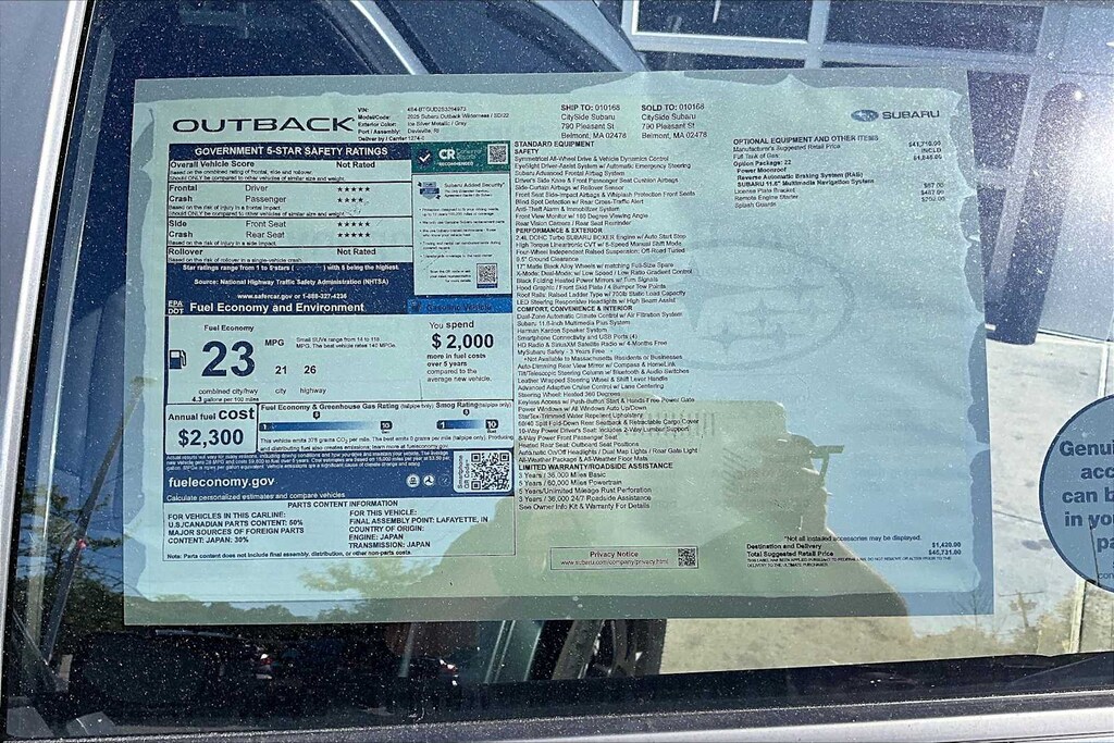 POWER MOONROOF & NAVIGATION & RAB Reverse Automatic Braking (RAB) System, Power Moonroof, tilt up and internal retracting w/auto-open/close and laminated, UV, dark tinted glass, Radio: Subaru 11.6 Multimedia System w/Navigation, AM/FM stereo, HD Radio, valet mode, multi-touch gesture high resolution display screen, voice activated controls and navigation, Bluetooth® audio streaming and hands-free phone connectivity w/SMS text messaging (refer to subaru.com for cell phone compatibility), Near Field Communication (NFC), TomTom navigation software w/What3words, iPod control capability, SiriusXM w/360L (4 months free trial/subscription required after), SiriusXM Traffic (3 years free trial/subscription required after), SiriusXM Travel Link (3 years free trial/subscription required after).