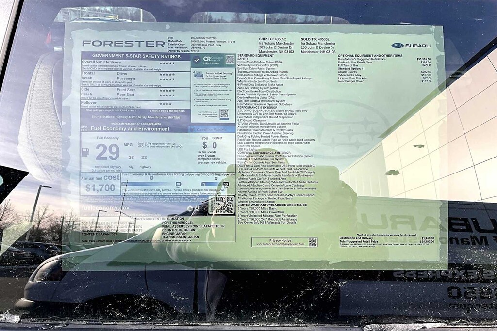 I bought this recently from Granite Subaru in Hudson, NH and I am so pleased I did. The Premium trim comes with great features AWD, Multiple cameras for safety, lane departure alert, 12" Media Screen with CarPlay, Panaramic Sunroof, roof racks, and much more. The size, features and gas mileage fit my life perfectly.