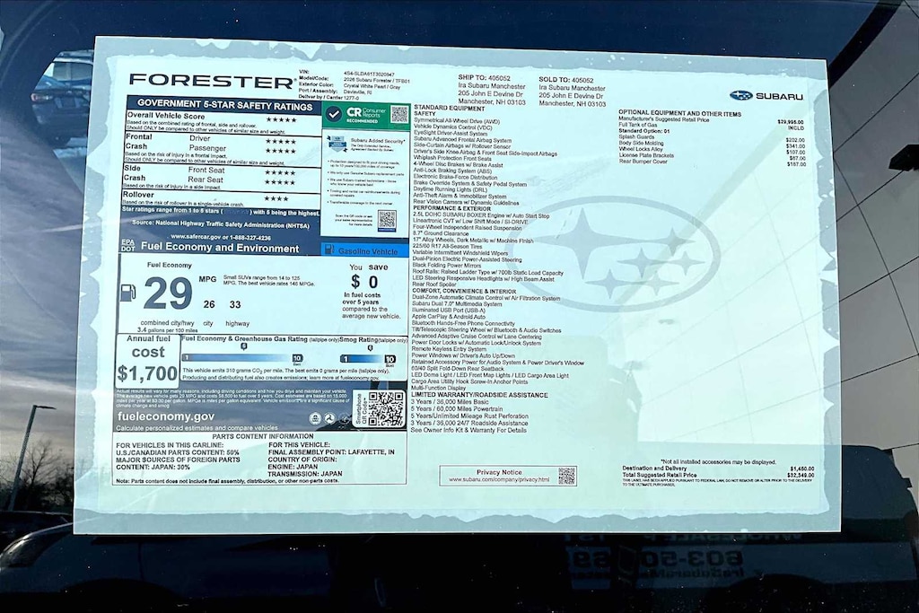 I bought this recently from Granite Subaru in Hudson, NH and I am so pleased I did. The Premium trim comes with great features AWD, Multiple cameras for safety, lane departure alert, 12" Media Screen with CarPlay, Panaramic Sunroof, roof racks, and much more. The size, features and gas mileage fit my life perfectly.