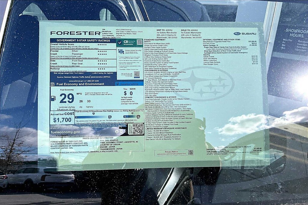 I bought this recently from Granite Subaru in Hudson, NH and I am so pleased I did. The Premium trim comes with great features AWD, Multiple cameras for safety, lane departure alert, 12" Media Screen with CarPlay, Panaramic Sunroof, roof racks, and much more. The size, features and gas mileage fit my life perfectly.
