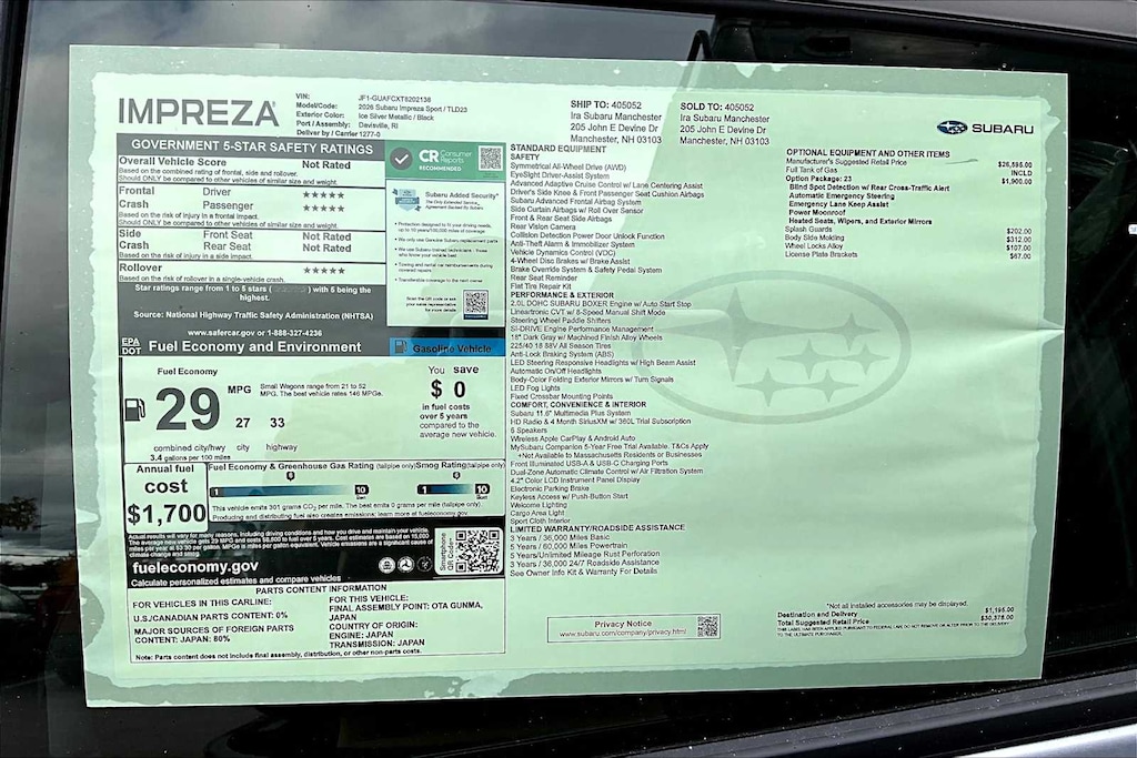 All Wheel Drive, Back-Up Camera, Satellite Radio, iPod/MP3 Input, Onboard Communications System. Subaru Sport with Ice Silver Metallic exterior and Black interior features a 4 Cylinder Engine with 152 HP at 6000 RPM*.